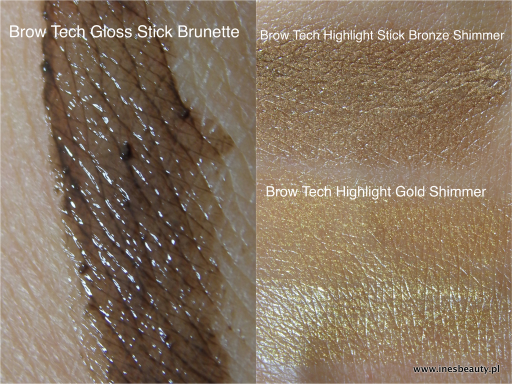 Delikatnie skrzące drobinki nie są nachalne, kolor Bronze Shimmer będzie idealny dla ciemniejszych brwi, a Gold Shimmer pięknie podkreśli look osób z jasnymi brwiami. Konsystencja obydwu sztyftów jest kremowa i gładko sunie podczas makijażu. Ja używam tego produktu jako kosmetyk wykończeniowy na wcześniej wykonany makijaż brwi sztyftem Brow Tech Gloss Stick Brunette.