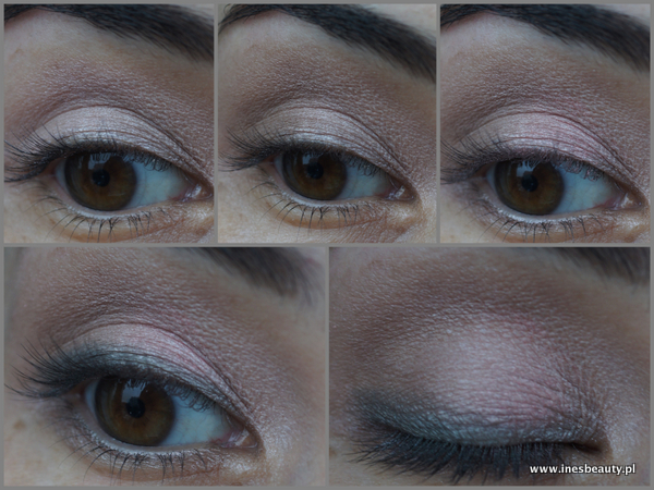 Na ruchomą powiekę najpierw nałożyłam drugi cień od prawej , bladoróżowy odcień , kącik zewnętrzny i załamanie powieki wymodelowałam pierwszym cieniem od prawej , na środek powieki i wewnętrzny kącik oka nałożyłam trzeci odcień z prawej, różowy cień. Kreskę , którą roztarłam wykonałam odcieniem zielonym , drugi z lewej strony.