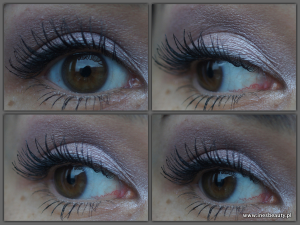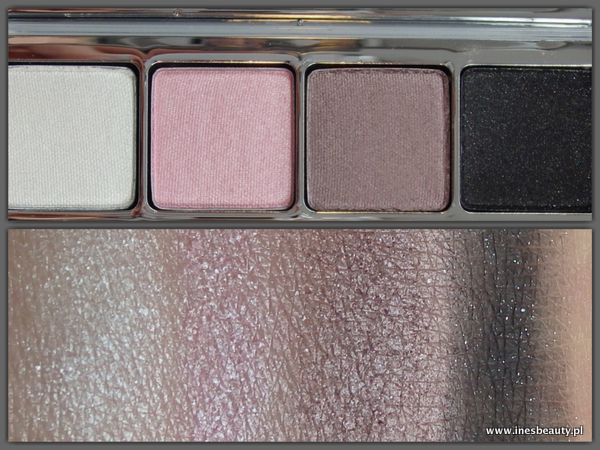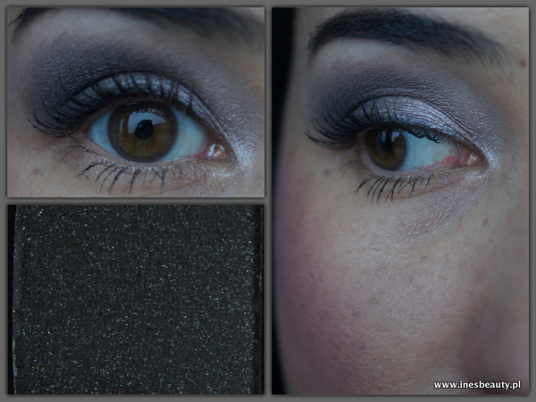 Najjaśniejszy cień, biały opalizuje delikatnie na zielono, różowy migocze ale nie jest to nachalne , drobinki rozcierają się na powiece pozostawiając perłowe wykończenie , brązowy odcień jest już mnie perłowy , daje bardziej satynowe wykończenie , czarny to matowy cień z drobinkami , które też nie są jakoś szczególnie widoczne na powiece. Jest to jeden z ładniejszych odcieni czerni jakie miałam okazję używać.