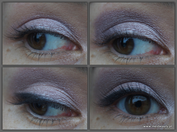 Na zdjęciach poniżej możecie zobaczyć każdy cień nałożony po kolei : makjiaż zaczęłam od nałożenia na powiekę ruchomą cienia różowego, następnie kącik zewnętrzny i załamanie powieki z użyciem cienia brązowego, kreskę wzdłuż linii rzęs wykonałam cieniem czarnym , a wewnętrzny kącik oka rozświetliłam cieniem białym.